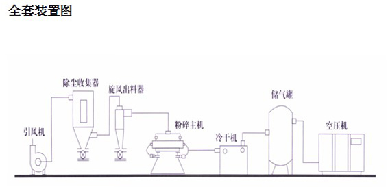 當(dāng)壓縮氣體通過(guò)加料噴射器,粉碎原料進(jìn)入粉碎室,在粉碎室外圍有多個(gè)粉碎噴嘴,噴射超音速氣流,使物料受到氣流高速?zèng)_擊以及物料相互碰撞,磨擦而粉碎,分級(jí)管把較粗的顆粒分離出來(lái),粗顆粒循環(huán)返回粉碎室內(nèi)繼續(xù)粉碎,經(jīng)過(guò)內(nèi)部閉路循環(huán)粉碎后,最后在出料口可獲得分布均勻的超微細(xì)粉。